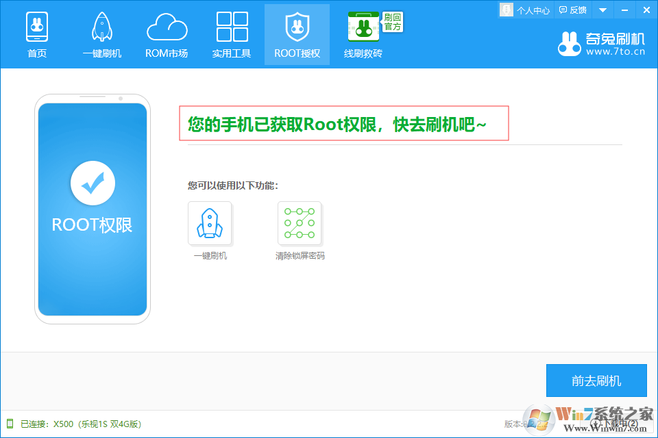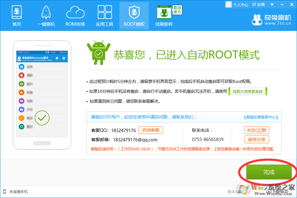 6、当手机重启后,再次连接奇兔刷机,会看到ROOT授权提示已变成如下图所示,则表示root成功。