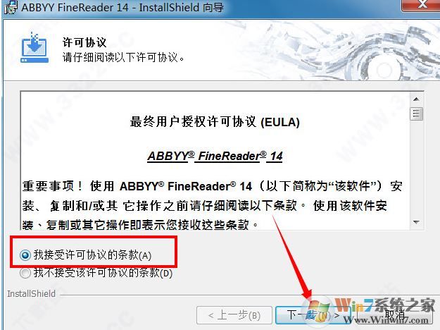 2、选择“接受”许可协议条款,进入“下一步”,如图: