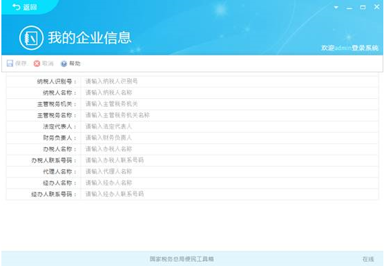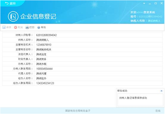 登记信息页面用户可以对企业信息进行修改、查看帮助文档等操作,企业信息包含纳税人识别号、纳税人名称、主管税务机关、主管税务机关名称、财务负责人、办税人名称、办税联系号码、代理人名称、经办人名称、经办人联系号码等信息。