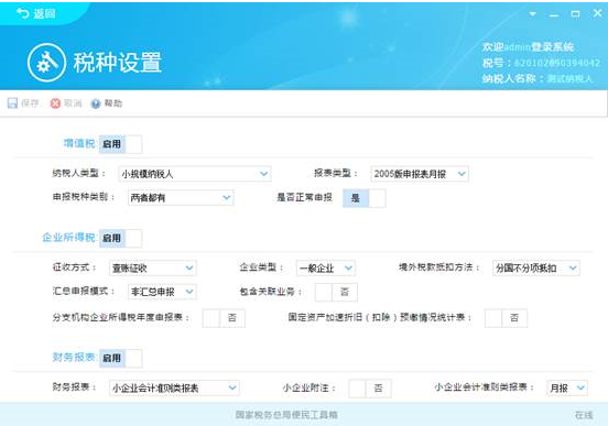 税种设置页面用户可以对税种进行修改、查看帮助文档等操作,税种设置包含对增值税、企业所得税、财务报表的启用设置,对纳税人类型、报表类型、申报税种类别、征收方式、企业类型、境外税款抵扣方法、汇总申报模式等信息。