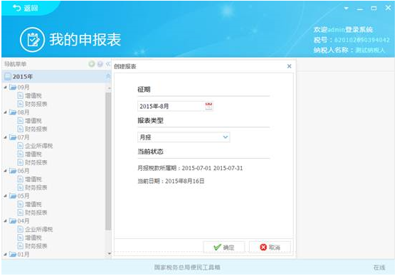 在我的申报表页面,用户可以根据选择不同的征期来创建申报表,系统会根据纳税人企业信息、税种信息自动创建需要填写的报表。申报表填写中点击,选择征收期、报表类型等信息,在当前状态中会动态根据选项的不同显示税款所属期,点击确定进行保存,系统会自动在导航栏中生成税款所属期的相关文件夹,用户可以填写相关报表进行申报。