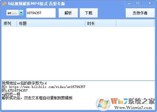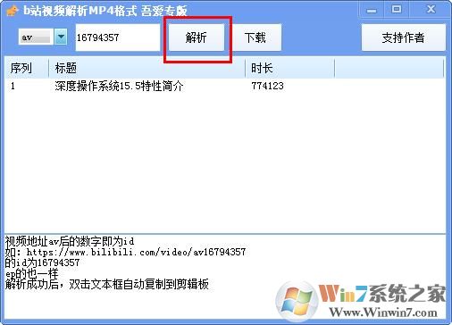 2、找到你想要下载的视频文件,复制他的av号,视频地址av后的数字即为id,比如https://www.bilibili.com/video/av16794357的id为16794357,然后点击解析。