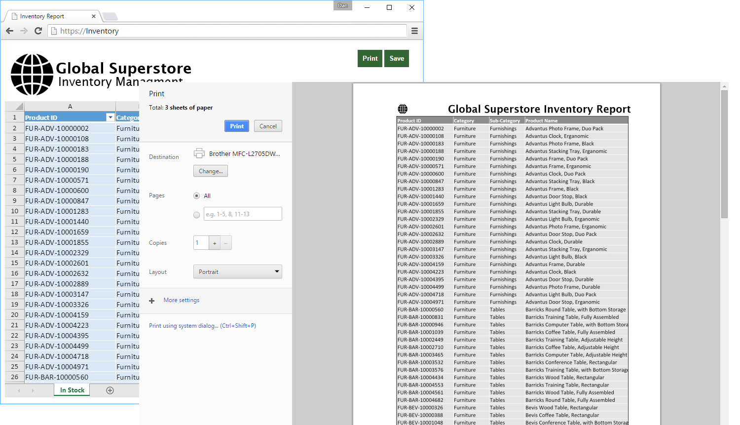 在页面上添加打印按钮,可以直接打开标准的浏览器打印窗口。SpreadJS满足您的各种打印细节设置需求:自适应文本高宽打印、网格线、边框、页眉、页脚、边距、页面自适应、页面尺寸、插入分页符等等。导入或导出Excel文件之后,打印设置依然可以保留。
