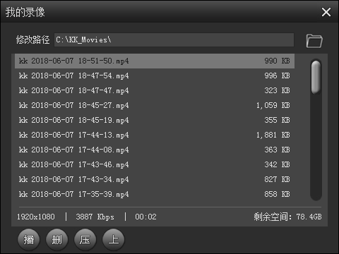 点击【我的录像】打开‘我的录像’对话框;双击视频文件或选中文件再点击下方的播放按钮即可播放视频;点击右上方的打开按钮打开保存目录查看文件;点‘修改路径’可修改生成文件的保存路径。