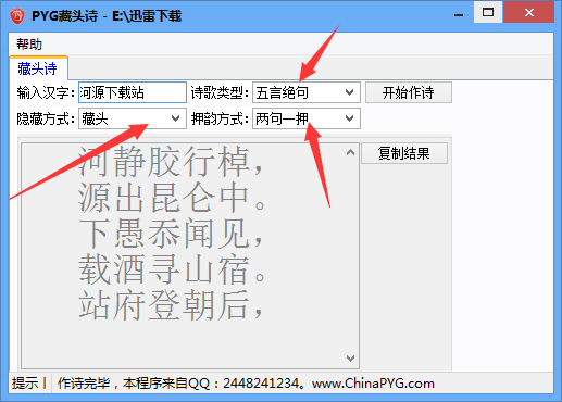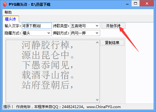 PYG藏头诗生成器就是一款能够快速自动生成藏头诗的藏头诗生成工具!需要将藏的字藏在诗头、诗中和诗尾,支持生成五言绝句和七言律诗,还可以自动有设置押韵方式,欢迎有需要的用户来获取这款PYG藏头诗生成器,喜欢的用户不要错过了哦!