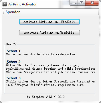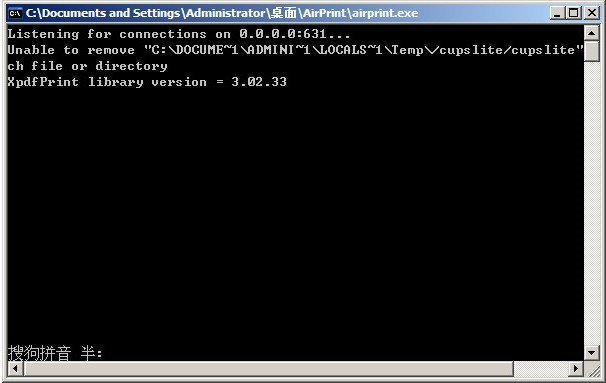 运行airprint.exe,32 bit Windows 到C:\Progame Files\Airprint 资料夹双击Airprint.exe运行; 64bit Windows 请到C:\Programe Files(X86)\AirPrint,会弹出命令窗口