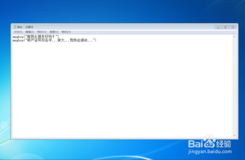 输入代码,不会编写代码的可以去网上查找,只需在百度输入vbs代码,就会有各种各样的代码,比如输入: