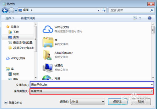 点击后会弹出以下窗口,文件名改成:表白示例.vbs,保存类型改为:所有文件,然后点击确定。