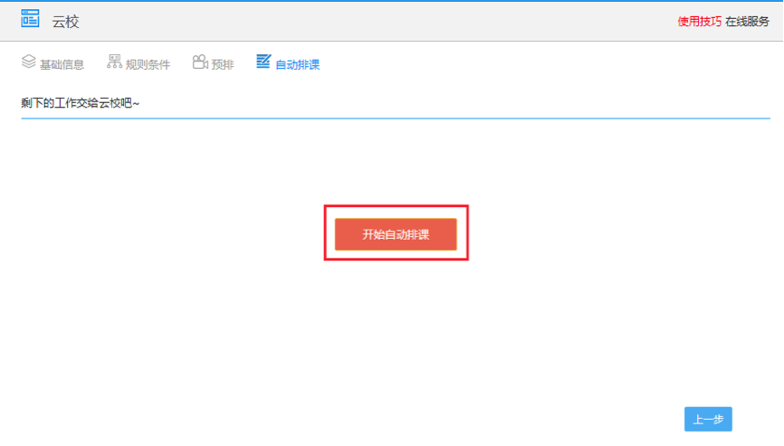 云校排课功能强大,包括:云端存储网络课表、全程支持在线帮助、支持不同教学模式、支持复杂条件(连堂课、合班、分层等)设置、一键自动排课、一键导入导出,等等。