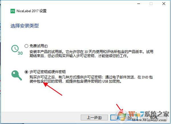4、选择“许可证密钥或硬件密钥”然后点击“下一步”