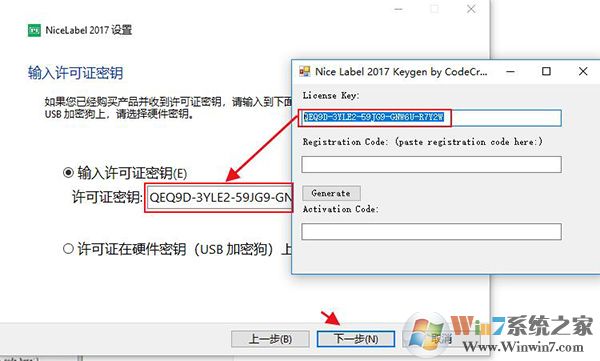 5、运行注册机。将注册机上的许可证密钥复制到软件上点击“下一步”不要关闭注册机