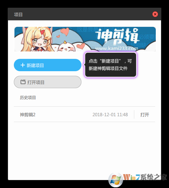 ①、双击电脑桌面的神剪辑图标,打开软件,在弹出的“项目”面板中,点击新建项目,如图1所示。