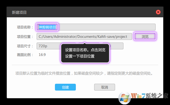 ②、在“新建项目”面板中,修改一下项目名称,按自己的喜好来,再点击“浏览”设置一下项目位置,如图2所示。