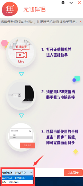 4) 设备列表中成功识别到手机后,点击无他伴侣上的【同步】按钮就可以看到手机直播助手与电脑端无他伴侣的同步画面了。