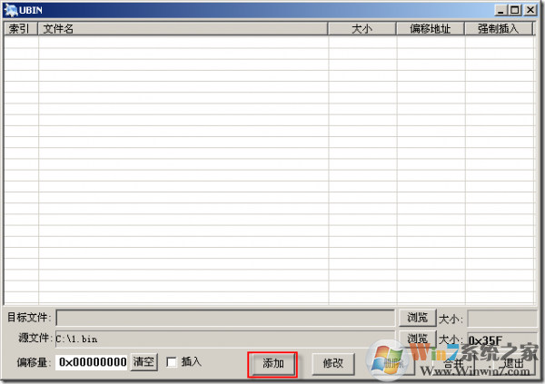 首先,添加第一个文件1.bin,其地址为0x0000,所以,偏移量设置为0x00000000,设置完偏移量后点击“添加”按钮。