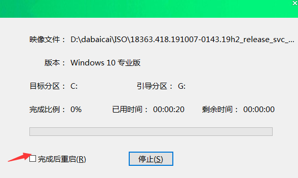 5、勾选【完成后重启】,一定要在重启前拔掉U盘,以免再次进入大白菜PE系统。