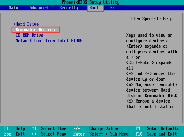 2、通过【左右方向键】切换到【Boot】,然后利用【上下方向键】键选择【removeble device】。(PS:不同电脑的显示也会有所不同,认准带USB字样开头或者是u盘名称即可)。