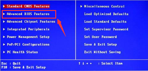 PS:由于主板的不同,那么出现的 bios设置界面也会有些不一样。若是Award bios,相应的界面就是如下图这样子的,这时就要选择【Advanced BIOS Features】,也就是高级bios设置,后面的相关操作也是大同小异。 故而,若是出现的界面有所不同也不要太慌张,可以自己根据主板的不同去上网查询具体的操作步骤。