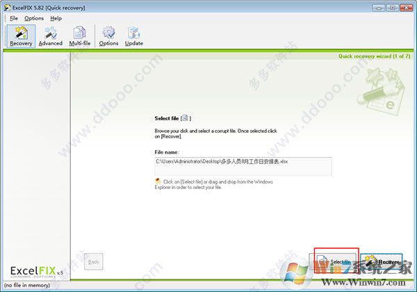 1、点击Flie选择selectfile按纽,选择你要修复的excel文件,如xls、xlsx、csv等;