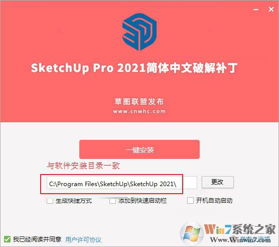 5、再运行软件包中的"2.SketchUp2021破解补丁.exe",安装目录需保持和软件的一致;