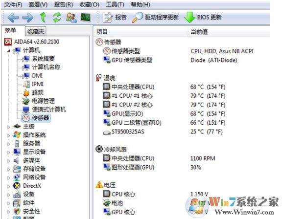 找到左侧的菜单栏中的计算机,然后在计算机下面找到传感器,这个时候点击传感器,过一会就会弹出检测的情况,如左侧的温度列表。