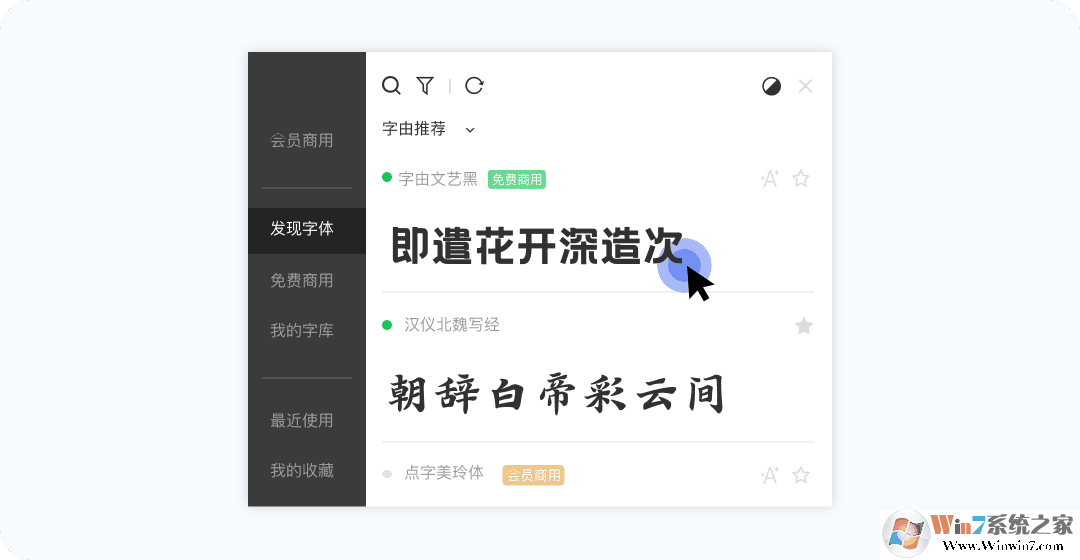 点击客户端字体预览区域,小绿灯亮起,字体激活成功在设计软件的字体下拉列表中,选中已经激活的字体