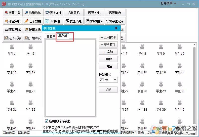 2.然后可以选择黑名单,单击添加相关软件(只输入关键词即可)来限制学生打开这些软件,白名单是限制学生能打开名单里的软件。