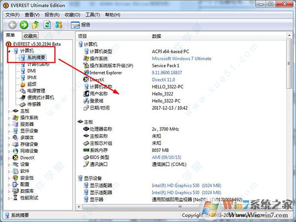 EVEREST Ultimate Edition 启动后,首先要看的就是计算机“概述”,单击“计算机”图标可以打开“概述”。单击“概述”后将在EVEREST Ultimate Edition 界面左边显示出我们计算机的一些详细情况。如下图所示,这里的信息比我们自己在电脑上查看的清楚得很。