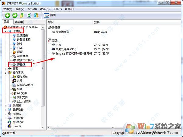 还是在“计算机”里,点击“传感器”即可详细显示主板、CPU、硬盘的温度及CPU的电压。非常方便!其实我用此版本的EVEREST Ultimate Edition 时候,这些温度在电脑的任务栏有显示的!
