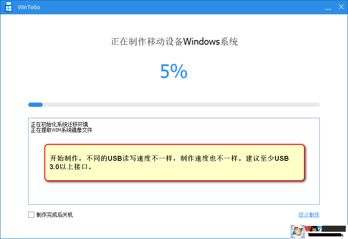 第四步:只需要等待执行完成即可,制作快慢和您的U盘或移动硬盘读写速度有关。
