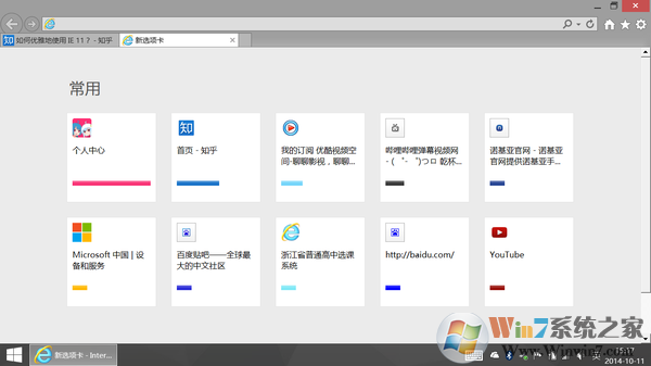 Internet Explorer 11(简称IE11),是继IE10之后的新版本网页浏览器,新版IE11相比较与IE10在浏览器的操作界面上差异并不大,但是在整体的性能上却有非常大的改进。选项卡界面已经移至底部,并且新增了Windows 8.1设备与Windows Phone同步标签的功能。IE 11也开始支持WebGL,并允许网站创建单独的动态磁贴模块,让用户可以将其添加到开始屏幕上,获得RSS更新。