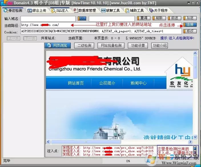 1、打开明小子,在当前路径这里输入你要注入的网站地址,然后连接如下图。如果此网站有注入点的话,下面注入点框内会出现红色的注入点地址。