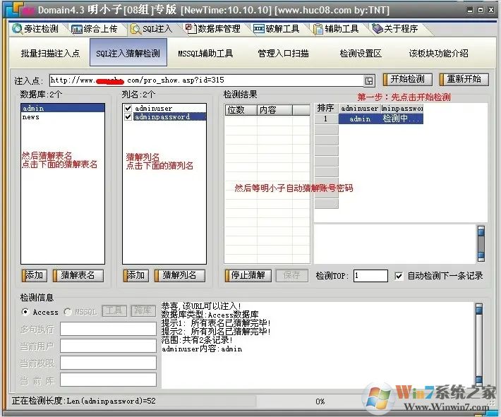 3、SQL注入检测功能介绍可批量对多个网站进行注入点扫描、SQL注入猜解功能(多线程检测,可猜解中文)、自动爆库功能、后台登陆地址扫描(多线程)、检测设置专区!