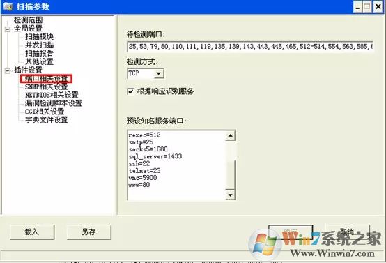 端口相关设置:设置与端口有关的项。待检测端口可以是任意端口的组合。检测方式使用TCP能够提高x-scan的准确性,但容易被对方的防火墙阻塞,SYN却相反。根据响应识别服务,x-scan能够根据响应判断运行的服务,即使端口已被更改。预设知名服务端口,可以自定义某些端口为知名服务端口。