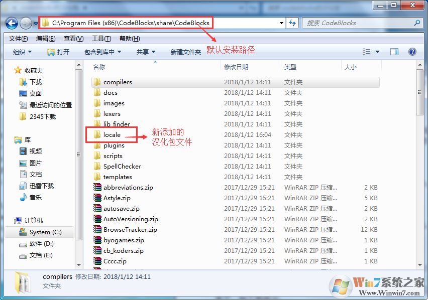 2) 进入 CodeBlocks 安装目录(其默认安装目录为 C:\Program Files (x86)\CodeBlocks),依次进入 share --> CodeBlocks 文件夹,然后将解压汉化包得到的 locale 文件夹,复制到 CodeBlocks 文件夹下,如下图所示: