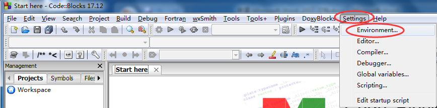 3) 打开 CodeBlocks,选择 “Settings --> Environmen”,如下图所示: