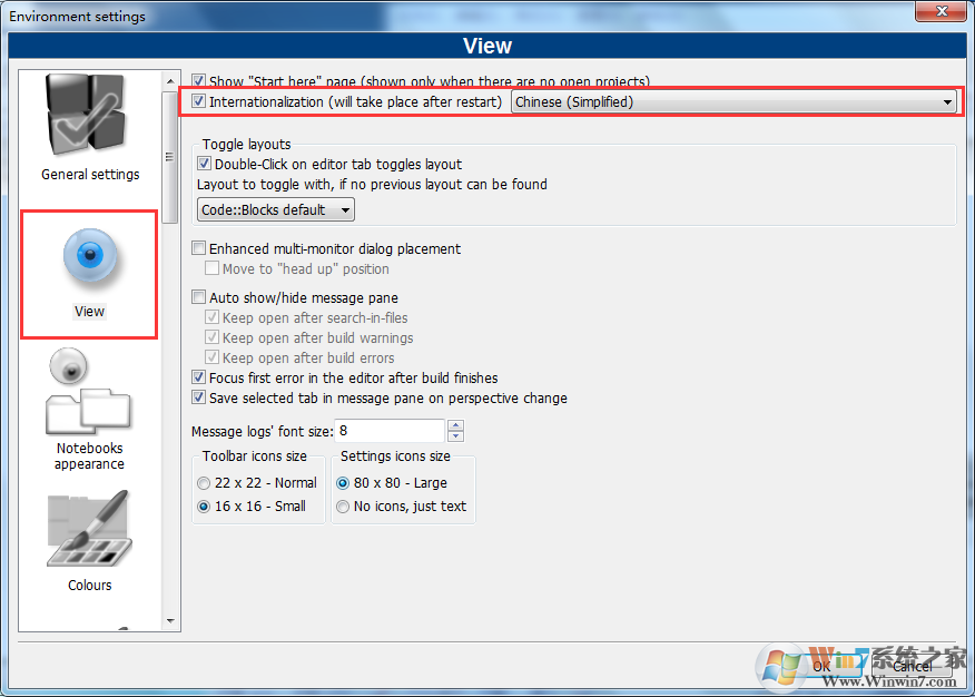 选择 View 选项,勾选 Internationalization 选项,同时选择其中的 Chinese(Simplified)。然后点击 OK 按钮。