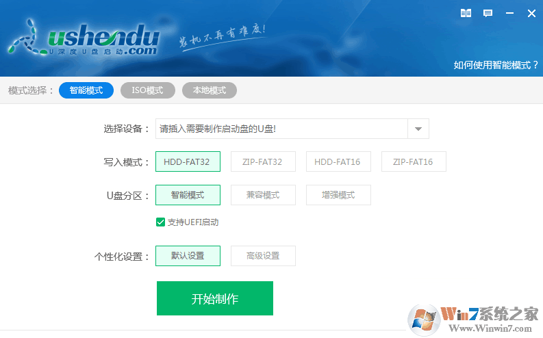 3、打开u深度u盘启动盘制作工具,将准备好的u盘插入电脑usb接口,等待软件自动识别所插入的u盘。随后无需修改界面中任何选项,与下图所示参数选项一致之后点击“开始制作”即可: