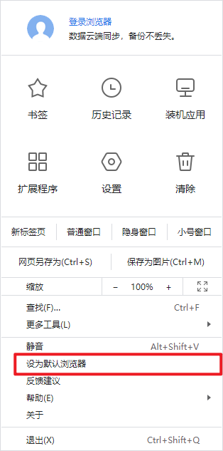 点击浏览器右上方的“自定义及控制”按钮、“设置”按钮,找到“默认浏览器”项 ,点击“将小智双核浏览器设置为默认浏览器”。