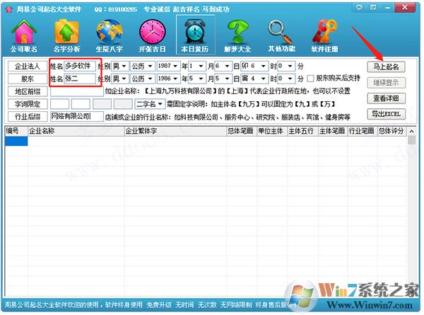 1、打开周易公司起名大全软件,默认是公司取名功能,输入“企业法人”和“股东”生日等信息之后点击右上角马上起名即可;