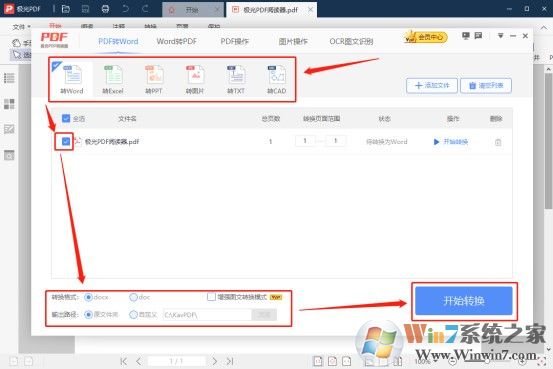 5、以PDF文件转换为Word格式为例。在新弹出的页面中,选择要转换的格式,然后勾选要转换的文件,并在左下角对文件进行存放设置等,最后点击“开始转换”按钮即可。