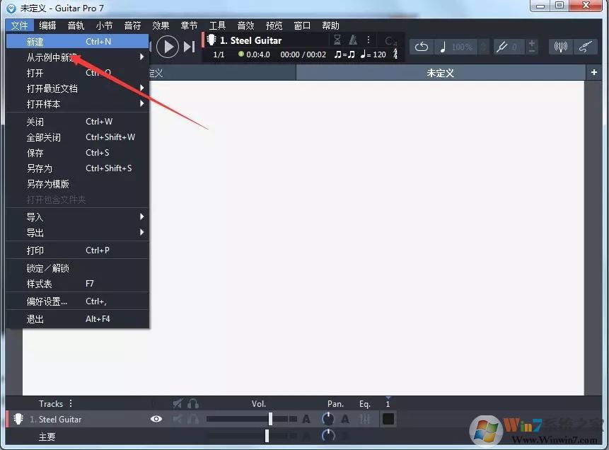 打开Guitar Pro 7,进入界面,先来建立一个文档,点击上方的【文件】——【新建】,