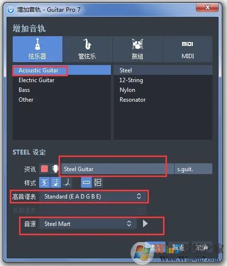 弹出如下界面,选择弦乐器种类Acoustic Guitar,STEEL设定为Steel Guitar,高音谱表默认标准,音源为Steel Mart,点击建立,