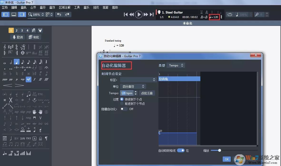 点击工具栏中的【j=120】,即可打开自动化编辑器,选择标签Freely,单位四分音符,Tempo默认120bpm,调整乐谱速度,