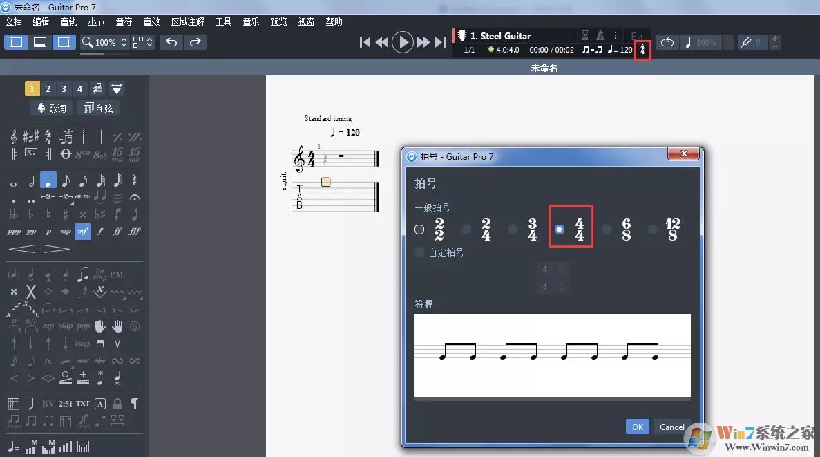 点击工具栏中的图标,弹出拍号窗口,选择4/4拍,