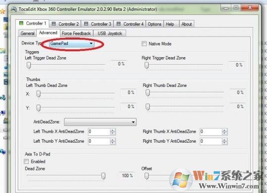 设好按钮和推杆后,把Advanced里的Device Type设定为Game Pad。