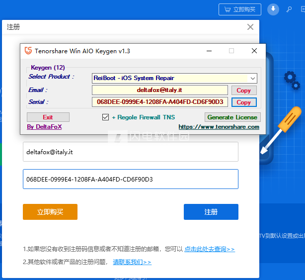 1???????安装完成,运行keygen,如图所示,选择本产品ReiBoot - iOS System Repair,点击generate生成按钮,在软件中点击钥匙按钮,将注册信息复制到软件中
