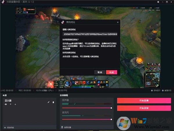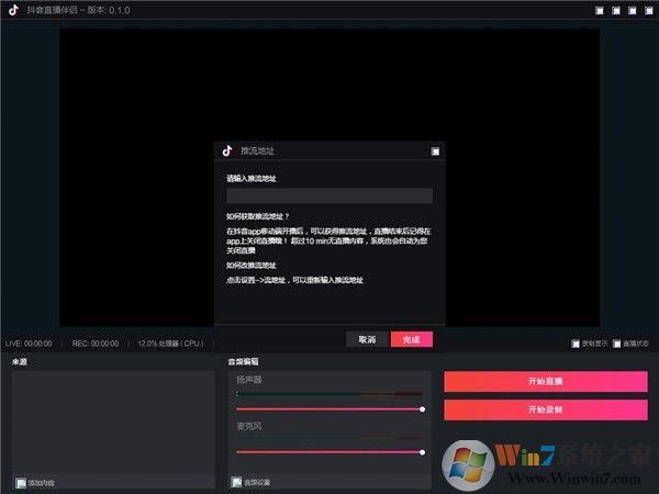 11、在弹出的推流地址窗口中输入你的抖音直播地址点击完成即可开始直播,这时候你可以最小化抖音直播伴侣开始直播了