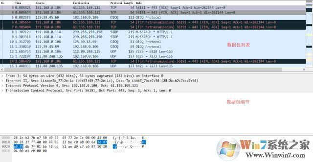 Packet Details(数据包细节):中间的面板分层次地显示了一个数据包中的内容,并且可以通过展开或是收缩来显示这个数据包中所捕获到的全部内容。