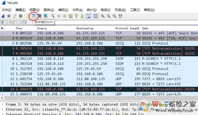 数据包采集完成后,可以像文件一样保存,你也可以将这个保存后的文件传给朋友,他们使用Wireshark依旧能够打开。这个常见的word文档道理类似。